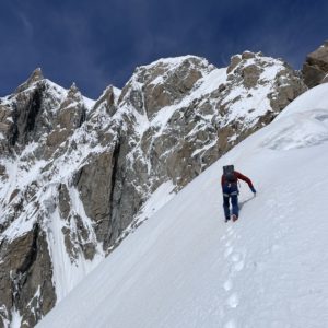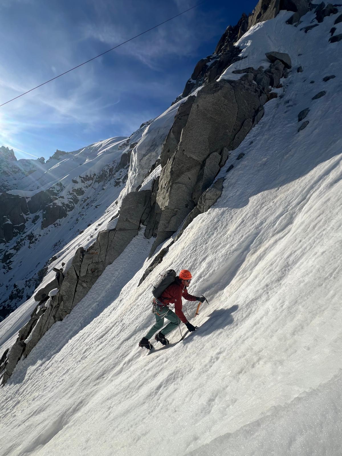 Start in Chamonix am “Grépon” Parkplatz 2:57 Uhr. Übern den Mont Blanc Tunnelsteig zur alten Mittelstation. Hier umgezogen. Und weiter Richtung Aiguille du Midi Nordwand. Einstieg ins “Mallory” und über dieses bis Aiguille du Midi. Angekommen am Grat ca 7:40Uhr (2700hm erledigt). Von hier direkt weiter, Abstieg in das Col du Midi und weiter vorbei an Tacul Ostwald und Grand Capucin. Ziel ist das Col Maudit wo wir um ca. um 9:30 Uhr in den Kuffner Grat eingestiegen sind.
