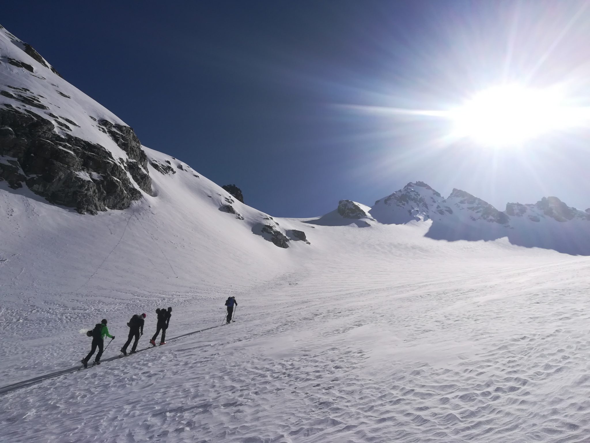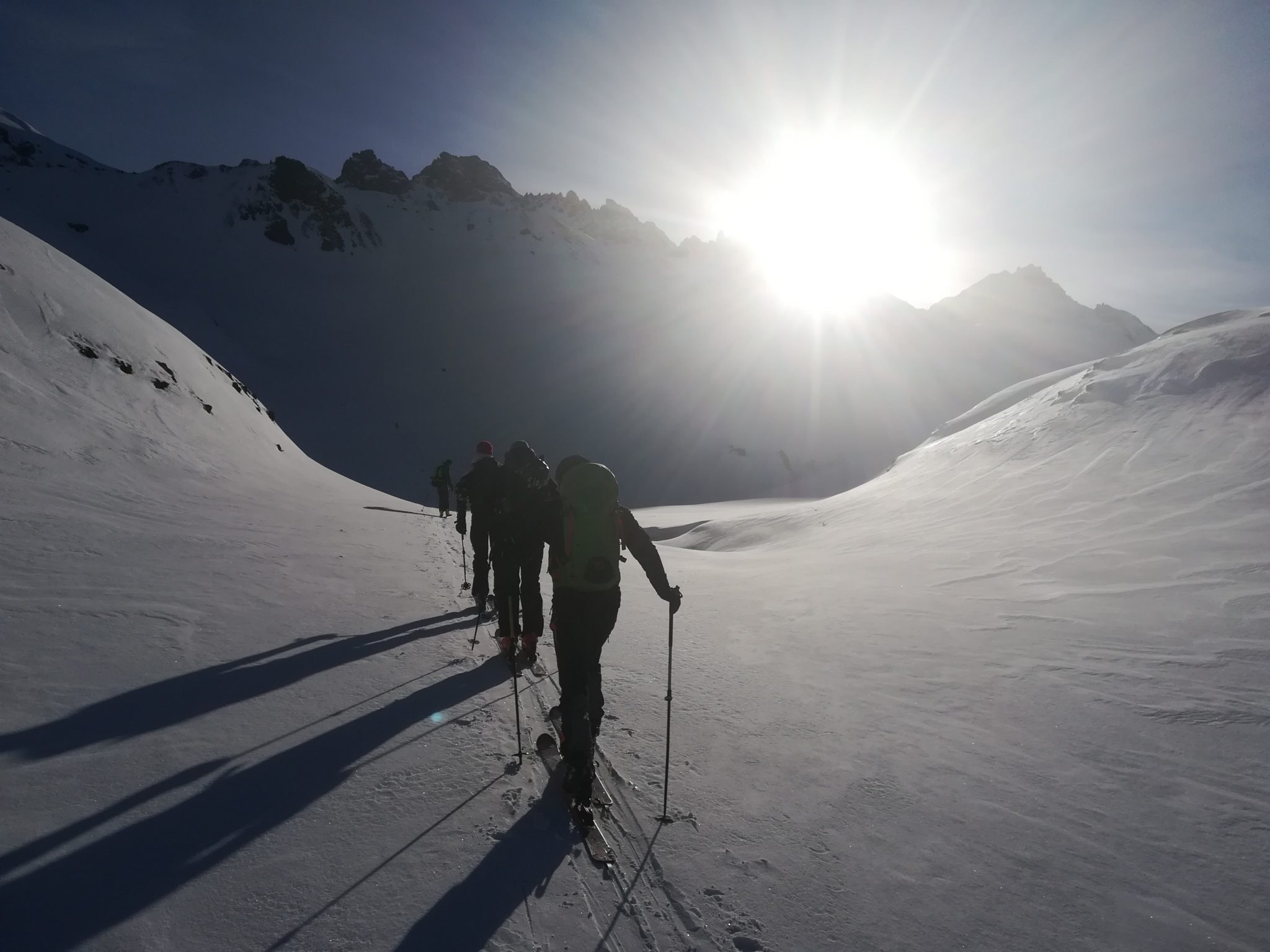 Wir richten uns bei der Tourenauswahl nach den aktuellen Bedingungen und ebenso nach den Wünschen der Gruppe. Die meisten Touren erfordern ca. 1.000 hm im Aufstieg und sind für Skihochtouren damit relativ moderat. Auch die Steilheit der Abfahrten bewegt sich im moderaten Schwierigkeitsbereich (meist 30° – 35°) und verspricht perfektes Skivergnügen. Natürlich zieht es uns Richtung unberührter Skihänge, und auch Ziele gibt es dafür zur Genüge: Piz Faschalba (3.047 m), Chalausköpfe (3.120 m), Gemsspitze (3.114 m), Ht. Jamspitze (3.156 m), Dreiländerspitze (3.197 m) und viele mehr.