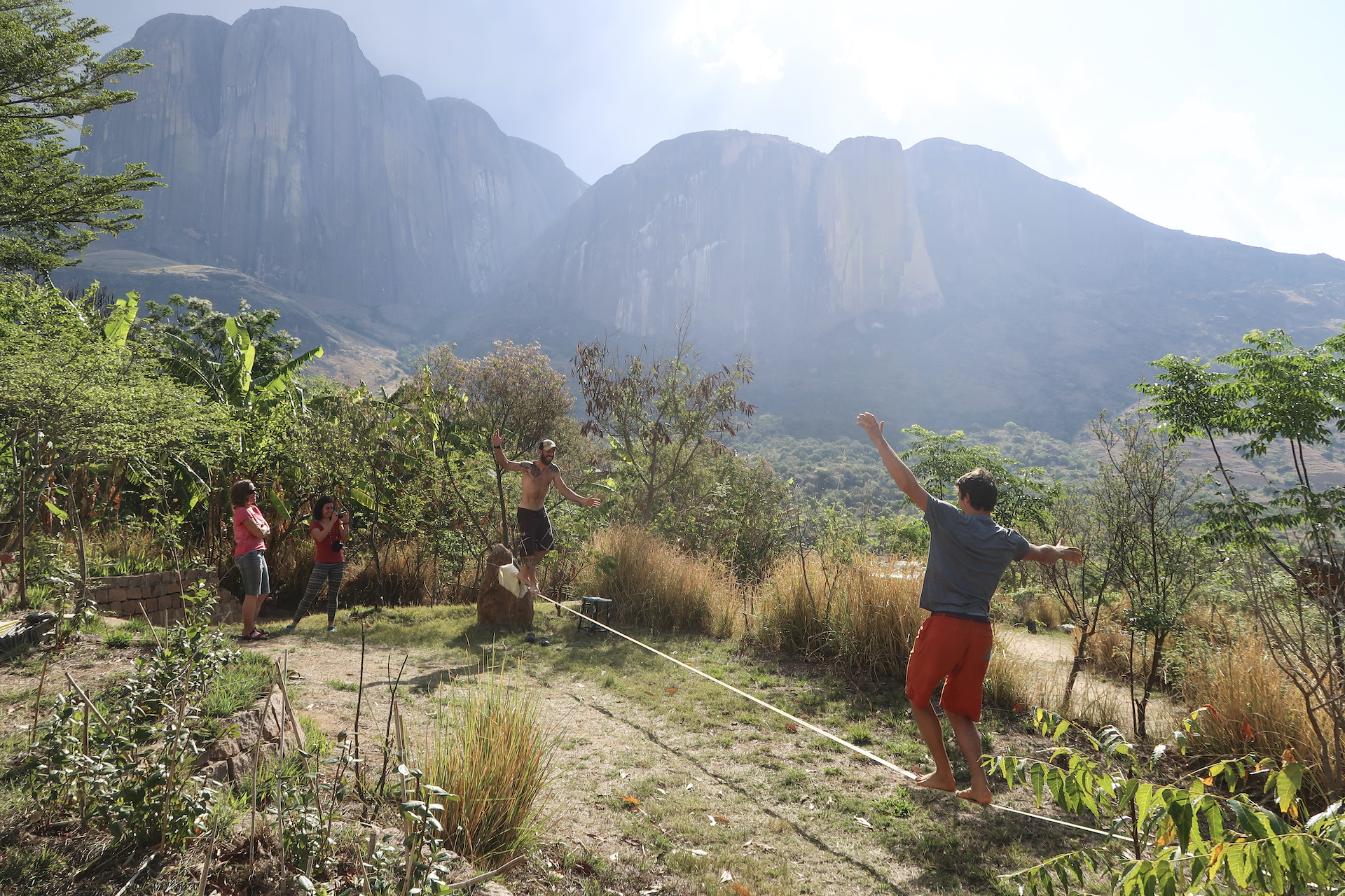 Es gibt genug Beschreibungen und Fotos über den Tsaranoro und seine Trabanten, also mache ich es kurz: Fette Grantiwände, wunderschöne, exotische Landschaften und kaum Kletterer. Großteils mit Bohrhaken abgesicherte Plattenklettereri in brutal grobkörnigem Granit, dazu Lemuren in den Wäldern und den Felswänden und Djungle-Sounds den ganzen Tag. Die Wände sind großteils Ostwände und die Temperaturen im Herbst sehr heiß für Klettern in der Sonne – das heißt: entweder sehr früh aufstehen oder erst zu Mittag starten. Die meisten Routen sind 6c und schwerer. Die Zustiege sind großteils einfach zu finden, die Abstiege teilweise tricky. Darum: im Zweifelsfall einheimische Führer nehmen. Die sind billig (ca. 20€ für Zu- und Abstieg), kennen sich super aus, finden auch ohne Stirnlampe und barfuß alle Zustiege im Dunkeln und warten auf Wunsch mit ein paar Flaschen Wasser und einem feinen „Riz cantonnaise“ am Gipfel, wenn ihr aus eurer Bigwall austoppt. Tooop!