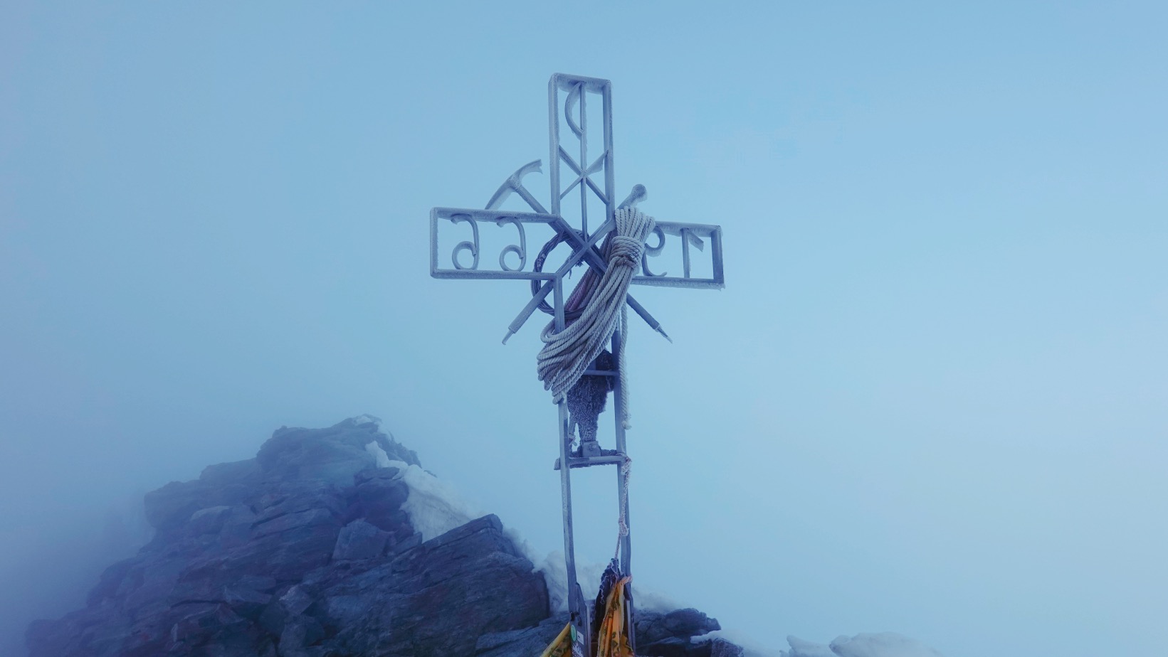 Mit etwa 15 weiteren Gipfel-Aspiranten starteten wir am nächsten Morgen Richtung Gipfel. Viel Zeit zum Aufwärmen gibt’s am Dent Blanche nicht, denn die Kletterei startet gleich hinter der Hütte. Spätestens nach dem ersten Aufschwung ist man wach. Noch im Dunkeln geht es über ein Schnee- und Eisfeld, danach über steiles Blockgelände hinauf. Im ersten Morgenlicht querten wir einen steilen Gletscherhang, bei dem sauberes Steigen mit den Steigeisen angesagt war. Dann ging die Kletterei richtig los. Am Fuße des großen Gendarmen angekommen entschieden wir uns für die leichtere, linke Umgehungsvariante. Denn leider schien uns das Wetter heute nicht ganz wohlgesonnen zu sein. Der Gipfel steckte in einer dicken Wolkenhaube und je höher wir kletterten desto tiefer drangen wir in diese Haube ein. Es wurde kälter und windiger. Und die Kletterei wurde nun schwieriger, das Ambiente richtig alpin und ausgesetzt. Einige Längen ging es steil im 3. Grad aufwärts – bei dem Wind und mit Handschuhen eine echte Herausforderung, die Jörg tapfer meisterte. Zum Glück war zumindest der Fels trocken und wir konnten ohne Steigeisen klettern. Auch wenn der Fels gutgriffig und schön war kam bei diesen Bedingungen kein bisschen Plaisir-Feeling auf. Für den letzten Abschnitt zogen wir noch einmal die Steigeisen an und freuten uns, dass die Schwierigkeiten nun nachließen. Ganz im Gegensatz zum Wind! Der tobte sich richtig aus! Immer wieder zeigte sich der blaue Himmel über uns und wir konnten die benachbarten Gipfel erahnen, aber die Wolken wollten sich einfach nicht auflösen. Ein gemeines Spiel! Als wir schließlich den Gipfel erreichten tat dies der Freude keinen Abbruch. Juchee, wir standen auf dem Gipfel der Dent Blanche, 4357m über dem Meer. Wir zogen uns warme Jacken an und freuten uns mit den anderen Seilschaften, die sich mit uns gemeinsam auf den Gipfel gekämpft haben. Der Gipfel der Dent Blanche ist ein besonderer. Davon zeugt auch eines der seltenen Schweizer Gipfelkreuze, das sehr schön mit Seilen und Pickel geschmückt ist.
