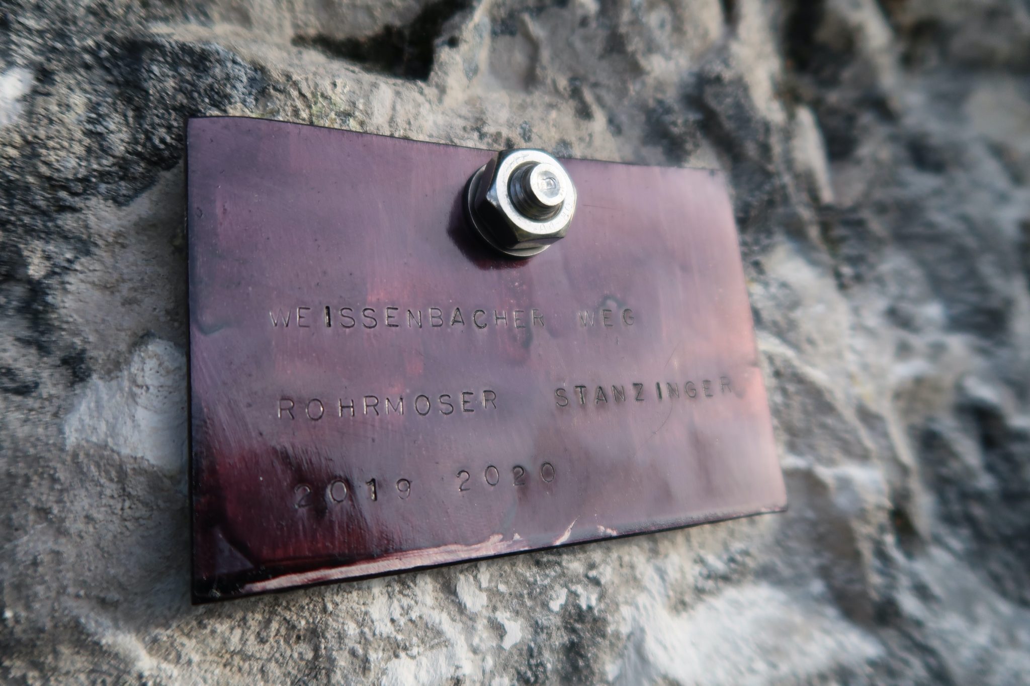 Nun waren wir in den oberen, hellen Platten angekommen. Das Gelände wurde langsam flacher, der Fels fest und schön und die Kletterei machte richtig Spaß. So war schließlich nur mehr eine Länge, 2 Schlaghaken und 8 Bohrhaken übrig. 4 Bohrhaken mussten für Standplätze zurückgehalten werden, also blieben für die letzten 45 Meter 6 Zwischenhaken. Der Wille, die Tour endlich fertig zu klettern, trieb mich mit vollem Fokus und Willen, dem Genuss üppiger Absicherung entbehrend, durch die steile Abschlusswand bis ich knapp unter der Spitze des Pfeilers auf einem gemütlichen Band 2 Standbohrhaken versenkte. Die Wand war endlich durchstiegen und wir sind unsere Tour zu Ende geklettert. Die Freude war groß, der Durst aber größer. Und so waren wir nach 6 teils sehr luftigen Abseilern wieder beim Einstieg und kurze Zeit später im Gastgarten der Bachbrücke beim Johnsbachsteg. Wir feierten die Entstehung des „Weißenbacher Wegs“, in Gedenken an unseren in den Tiefen der Gemeindefusionierungen verschwundenen Heimatort.